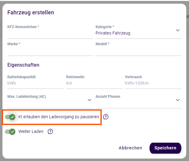 Im LADEportal können Fahrzeuge angelegt und verwaltet werden. Dies ermöglicht zum Beispiel eine Zuordnung von Ladevorgängen zu bestimmten Poolfahrzeugen. Zudem kann die künstliche Intelligenz von LADE damit das Laden des Fahrzeugs optimal planen. Je mehr Details Sie angeben, desto besser arbeitet die KI.