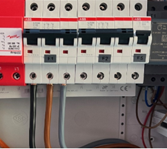 • Abgehende Versorgungsleitung am rechten LS-Schalter phasengenau sowie an den Klemmen für Nullleiter und PE festklemmen.