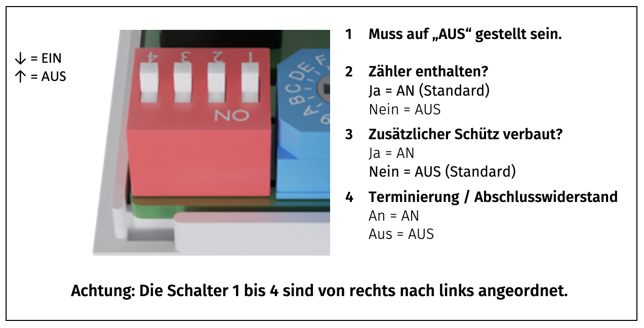 Terminierung: Am letzten IO-Modul innerhalb eines Buses muss ein Abschlusswiderstand (Terminierung) eingeschaltet werden.