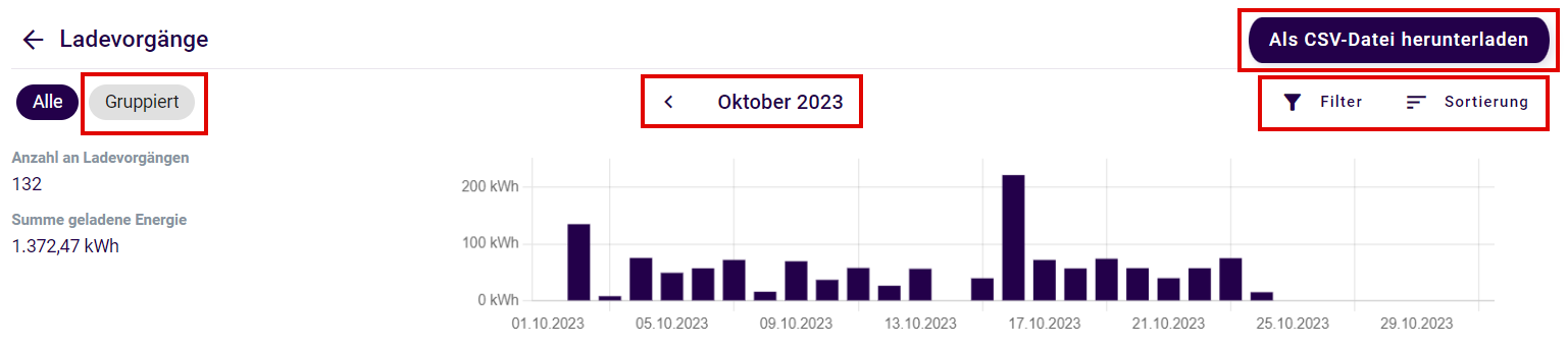 Oben rechts können Sie die Ladevorgänge nach Nutzern und / oder Ladepunkten filtern. Hier stehen außerdem verschiedene Möglichkeiten zur Sortierung zur Verfügung.