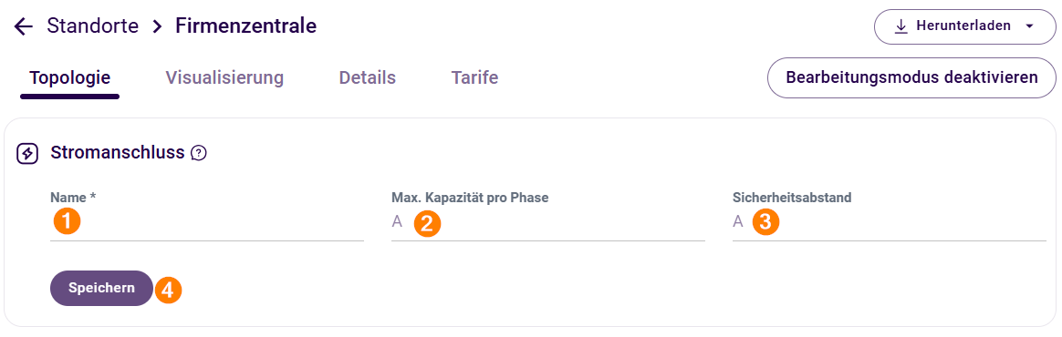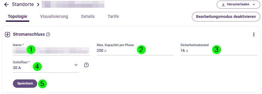 Damit das Last- und Energiemanagement korrekt funktioniert, muss die Topologie der Installation ins LADEportal übertragen werden. Dazu gehören zum Beispiel Informationen zum Stromanschluss und der Unterverteilung am jeweiligen Standort.