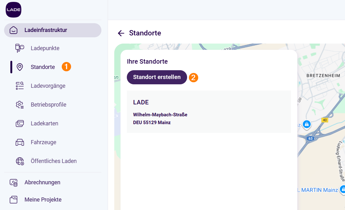 Wählen Sie im Hauptmenü im Abschnitt Ladeinfrastruktur den Punkt Standorte (1) und klicken Sie anschließend auf Standort erstellen (2).
