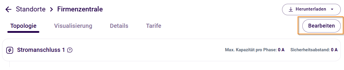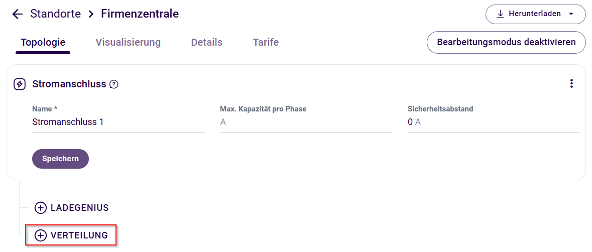 Sie können die Topologie eines Standorts auch zu einem späteren Zeitpunkt bearbeiten. Wählen Sie dafür den gewünschten Standort aus und klicken Sie auf den Button Bearbeiten. Nun können Sie weitere Verteilungen und Geräte hinzufügen sowie bestehende Geräte und Verteilungen bearbeiten.
