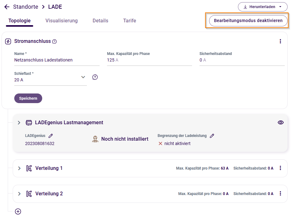 Wenn Sie mit der Einrichtung aller Verteilungen und Ladestationen fertig sind, beenden Sie den Bearbeitungsmodus mit dem Button oben rechts. Sie können nun mit der Installation oder der Inbetriebnahme fortfahren.